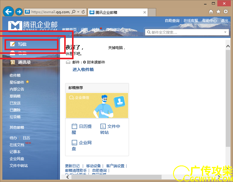以腾讯企业邮为例,登陆后点击页面中的“写信”。本文 来自广传攻柴原创