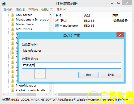 "HKEY_LOCAL_MACHINE\SOFTWARE\Microsoft\Windows\CurrentVersion\OEMInformation",在右侧窗口单击右键→新建→单击“字符串值”,并将新建的值命名为“Manufacturer”。本文来自广传攻 柴原创